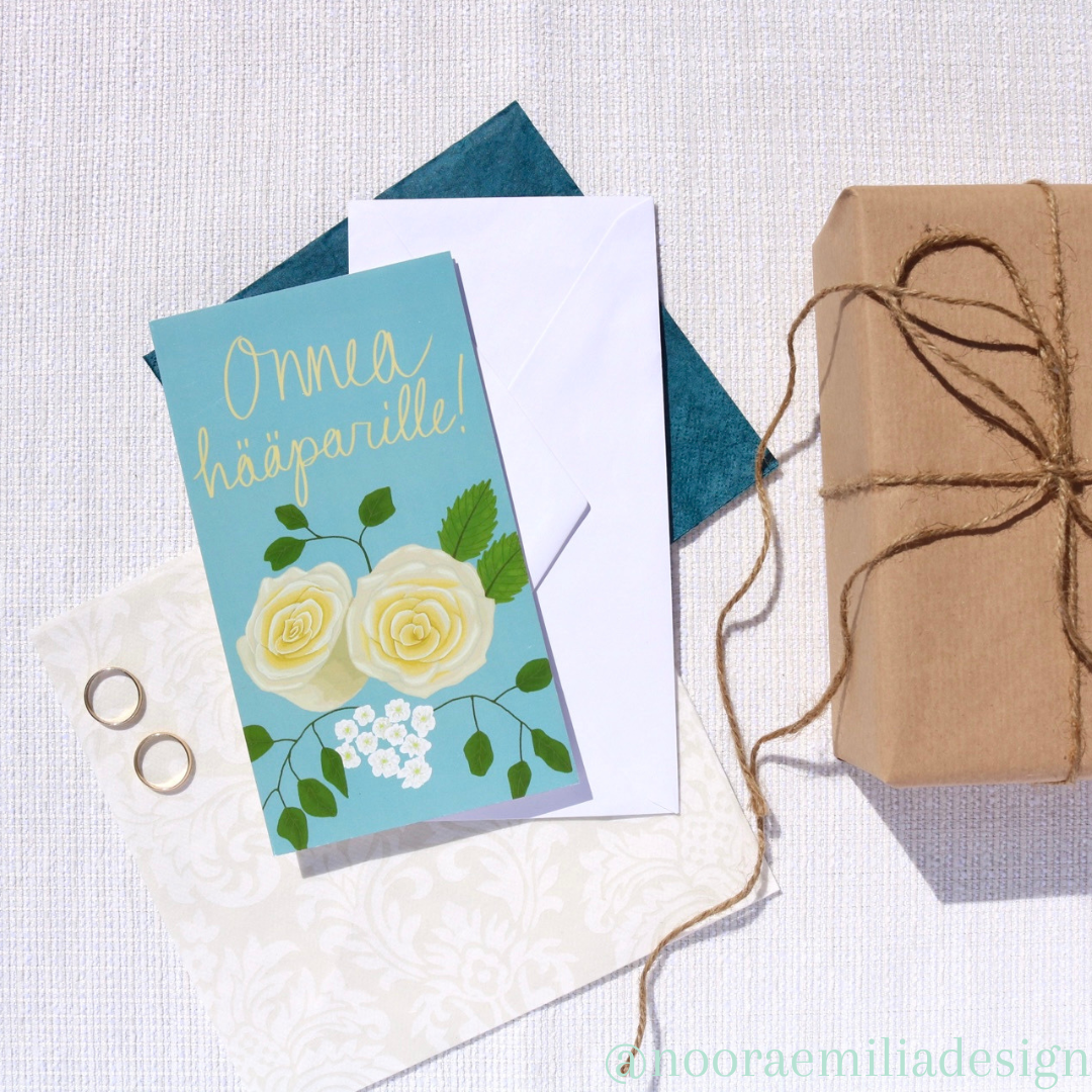 Nämä kortit on kuvittanut Noora Takku. Kortin mukana tulee valkoinen kirjekuori. Osa korteista on kokoa A6 ja osa on pitkämäisiä.