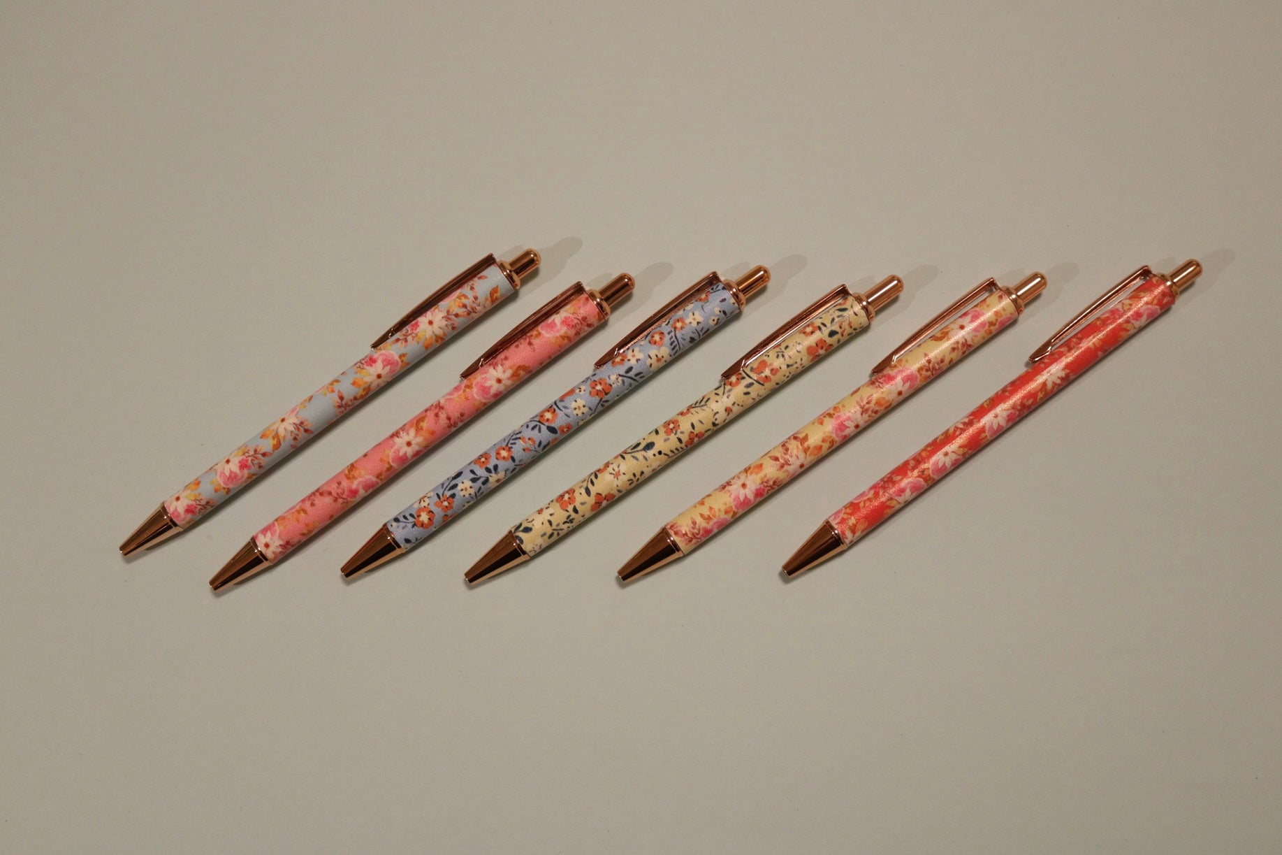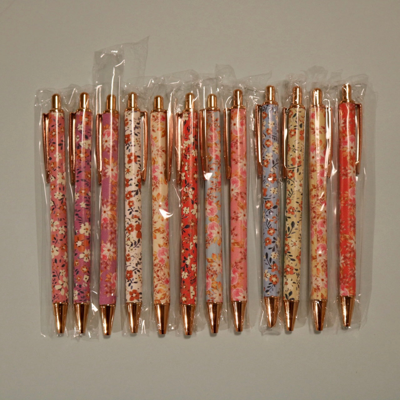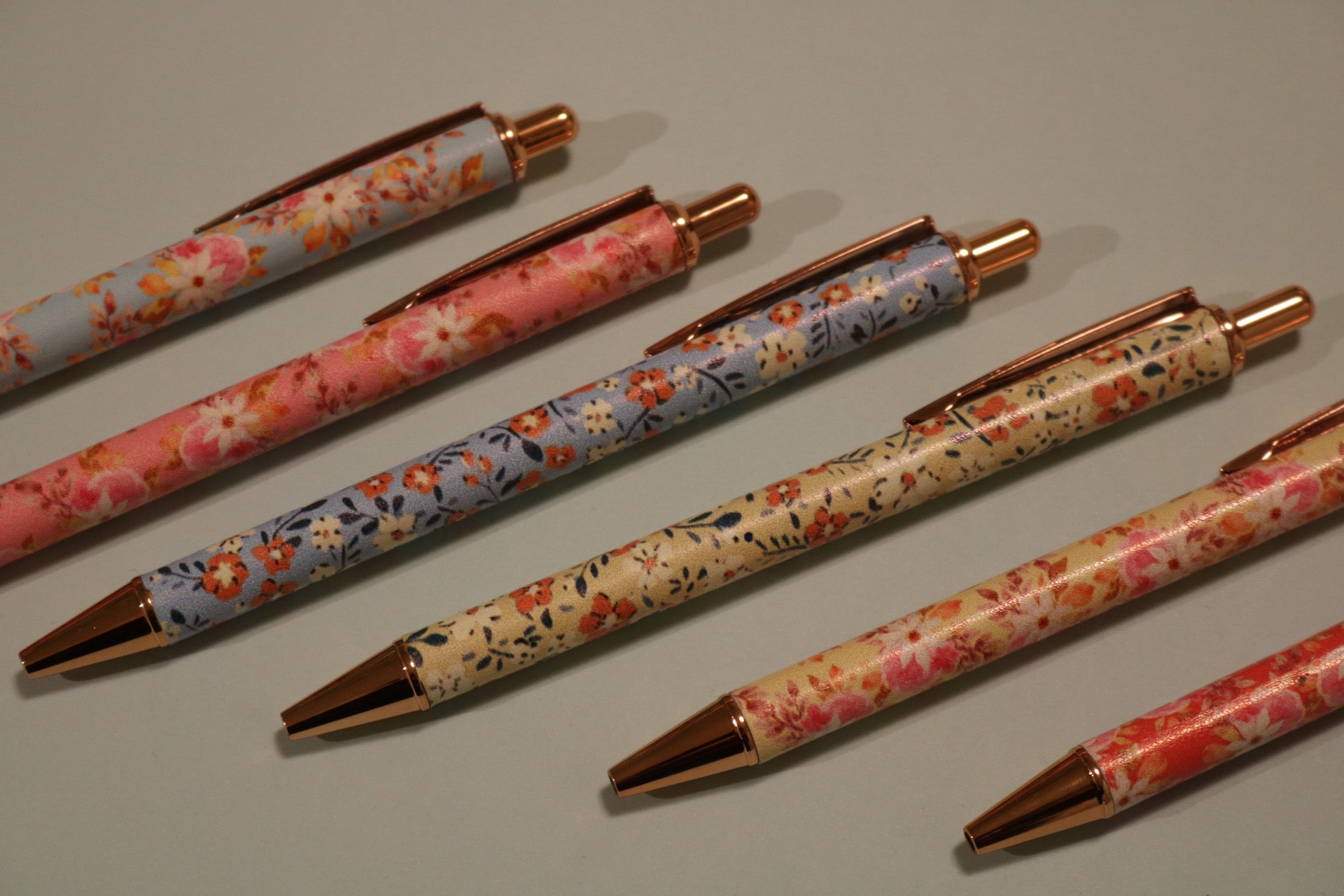 Sekalaisia erivärisiä kukkakuvioisia kyniä.