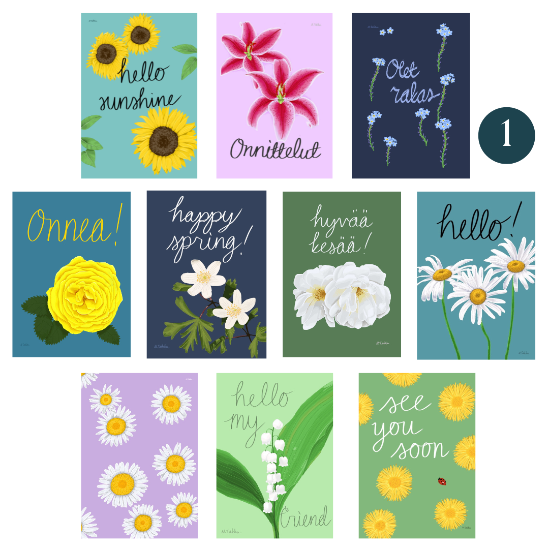 Korttisetti sisältää 10kpl postikortteja. Kuvittanut Noora Takku. Kortit painettu Suomessa laadukkaalle kartongille. Kortin toisella puolella on osoiterivi ja tilaa tekstille.